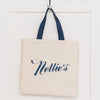 Nellie's logo cream coloured lined tote with blue straps